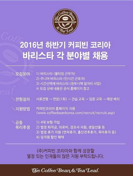 커피빈, 2016년 하반기 신규 바리스타 채용 모집…내달 7일 마감