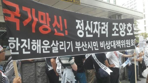 이들은 '부산없이 해운없다' '살리자 한진' '결사항쟁' '생존권 사수' 등이 새겨진 머리띠와 피켓 등을 앞세우고, 이번 사태를 일으킨 정부와 한진해운의 대주주인 조양호 한진그룹 회장이 책임을 져야 한다고 주장했다.