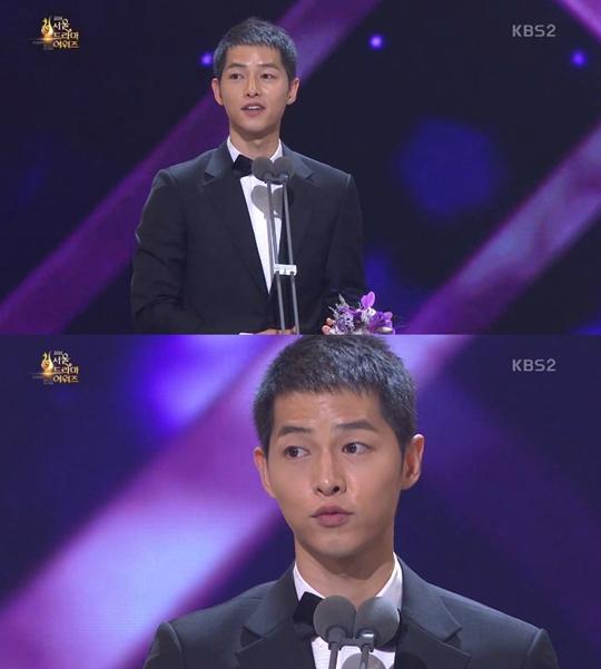 배우 송중기가 서울드라마어워즈 2016에서 드라마 '태양의 후예'로 한류드라마 남자 연기자상을 수상했다.
