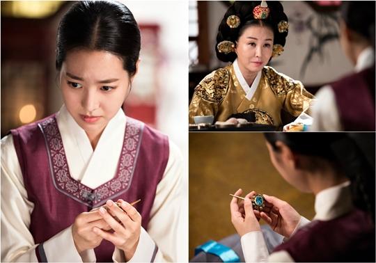 문정왕후 앞에 앉은 옥녀가 모친의 유품과 똑같은 모양의 머리 뒤꽂이를 손에 들고 있다. 옥녀는 두 손으로 조심스럽게 뒤꽂이를 들고 지긋이 바라보다가 시선을 돌려 생각에 잠긴 모습이다. 흔들리는 옥녀의 눈동자에서 그의 혼란스러운 심경이 고스란히 전해지는 듯 하다.