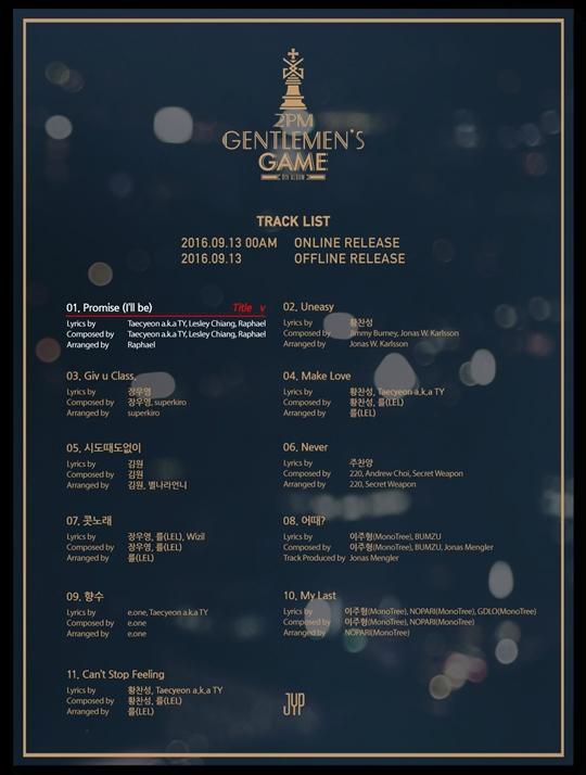 10일 소속사 JYP엔터테인먼트는 공식 SNS 채널 등을 통해 2PM의 새 정규 앨범 '젠틀맨스 게임'(GENTLEMEN'S GAME)의 트랙리스트를 공개했다.