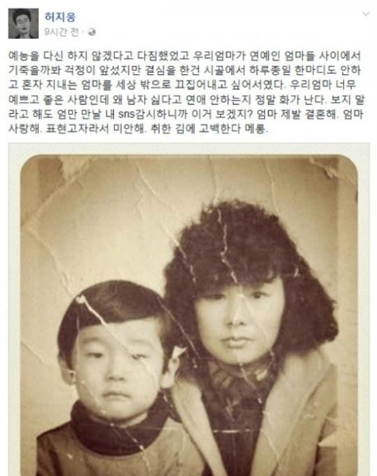 허지웅은 최근 자신의 SNS을 통해 어린 시절 어머니와 찍은 사진을 공개하면서 "예능을 다시 하지 않겠다고 다짐했었고 우리 엄마가 연예인 엄마들 사이에서 기죽을까봐 걱정이 앞섰다"고 말했다.