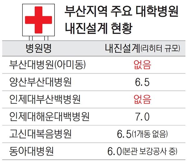 1988년 내진설계 의무화 이전에 지어진 오래된 병원 건물 상당수가 지진에 취약하다는 점도 또 다른 위험요소다. 현재 1600여 명이 입원하고 있는 부산대학병원의 경우 신축건물인 뇌혈관질환센터의 경우에는 규모 7.0 지진을 견딜 수 있지만, 1979년도에 지어진 건물 대다수는 내진설계가 돼 있지 않다. 동아대병원은 최근 내진설계가 돼 있지 않았던 본관에 대해 내진 보강을 시행 중이다.