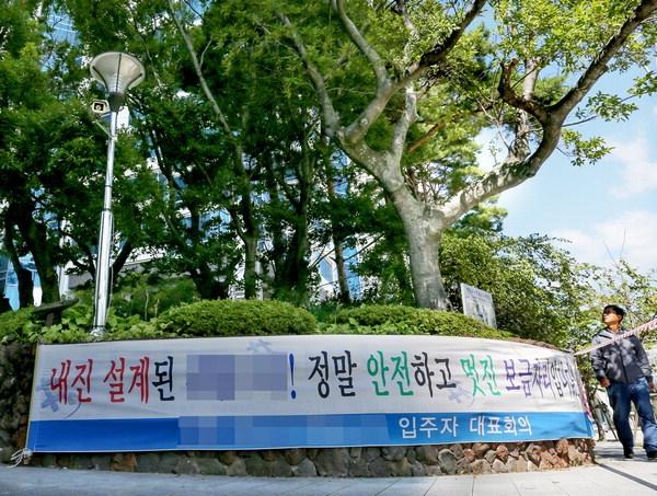 20일 부산 해운대구 센텀시티의 한 아파트 입구에 '내진설계가 돼 지진으로부터 안전한 보금자리'라는 내용의 플래카드가 내걸려 있다. 강선배 기자"우리 아파트는 지진에도 끄떡없습니다."