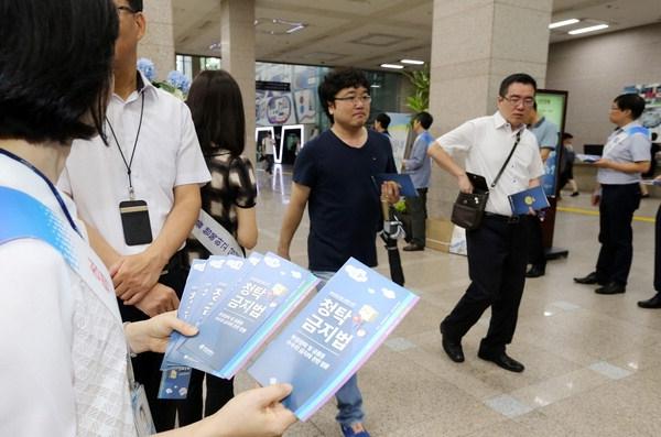 청탁금지법 시행 첫날인 28일 부산시청 감사관실 직원들이 1층 출입구에서 청렴 캠페인을 벌이고 있다. 김경현 기자 view@직장인 김 모(38) 씨는 최근 대학원 지도 교수에게 케이크를 선물하려다 정중히 거절당했다. 지난 28일 김영란법 적용으로 선물, 음식 등을 일체 받을 수 없다는 말만 들었다고 한다. 혹시나 청탁 등으로 오인을 받아 신고당할 수 있기 때문이다. 김 씨는 순수하게 '감사의 의미'로 케이크를 구입했다고 하소연해도 소용이 없었다. 김 씨는 "논문 작성 등에 많은 도움을 많이 받아 감사의 마음을 전하려 했다"며 "마음을 전달하는 것조차 법에 저촉될 수 있다고 하니 무척 안타깝다"고 말했다.