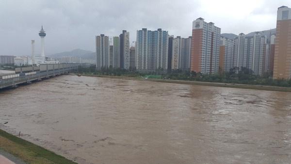 2005년 본보의 보도를 계기로 높게 조성된 경남 양산의 양산천 제방 사이로 태풍 '차바' 때 내린 폭우가 아슬아슬하게 흘러가고 있다. 양산시 제공지난 5일 부산·울산·경남지역에 막대한 피해를 준 제18호 태풍 '차바'의 내습 전 이뤄진 경남 양산시의 선제적인 양산천 보강 대책이 15만 명의 신도시 주민을 절체절명의 침수 위기에서 구한 것으로 밝혀졌다.