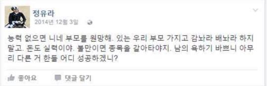 19일 경향신문의 보도에 따르면 정씨는 2014년 SNS에 "능력 없으면 니네 부모를 원망해. 감놔라 배놔라 하지 말고. 돈도 실력이야. 불만이면 종목을 갈아타야지. 남의 욕하기 바쁘니 아무리 다른 거 한들 어디 성공하겠니?"라는 글을 올린 것으로 알려졌다.