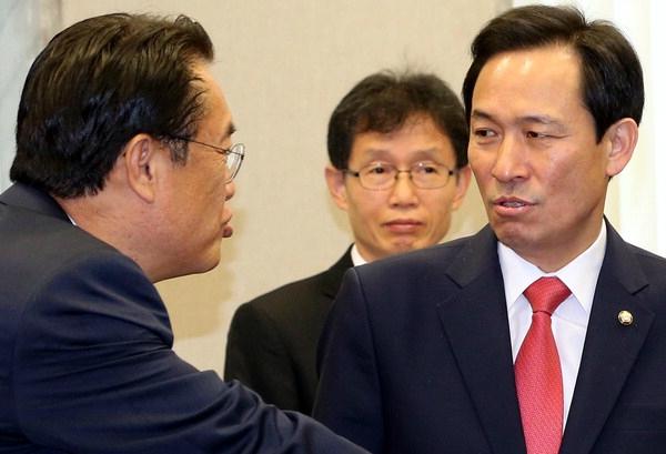 20일 오전 국회에서 열린 국회 운영위원회의 국가인권위원회에 대한 국정감사에서 새누리당 정진석(왼쪽) 원내대표와 더불어민주당 우상호 원내대표가 이야기를 나누고 있다. 박희만 기자 phman@이병호 국가정보원장의 '송민순 회고록'에 대한 발언 이후 여야의 '진실 공방전'이 오히려 심화되고 있다.