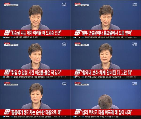 박근혜 대통령이 25일 청와대 춘추관을 찾아 비선실세 의혹을 받는 최순실 씨에게 각종 연설문과 발언자료 등이 유출됐다는 의혹과 관련, 사실을 인정하고 대국민 사과를 했다.