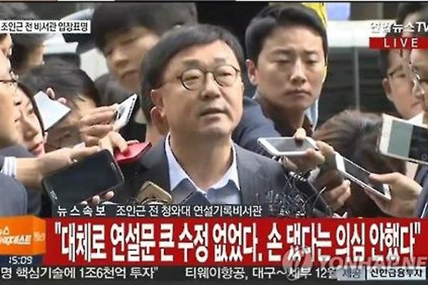 조 전 비서관은 "청와대와 일절 교감은 없었다"고 선을 긋고 "최순실 씨는 이번 언론 보도를 통해 알았다"고 말했다. 또 비서관 재직 시절 최종 연설문이 달라진 경로를 사전에 확인하지 않았냐는 질문에 "연설문이 이상하게 고쳐져 돌아온 적은 없다"고 말했다.