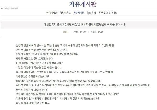 중2 학생, 청와대 자유게시판에 "세월호 7시간 동안 무엇을 하셨습니까?" 답변 기다려