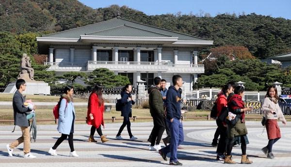 '비선실세'로 지목된 최순실 씨의 국정농단 의혹을 수사하는 검찰 특별수사본부가 30일 청와대에 대한 2차 압수수색을 벌인 가운데 이날 청와대 분수대 앞에서 중국인 관광객들이 관광하고 있다. 연합뉴스