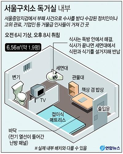 서울구치소로 이송된 최 씨도 건강검진과 신체검사를 받았을 것으로 보인다. 휴대한 물건을 영치한 후 수의를 착용한 채 구치소 생활 안내도 받았을 것이다. 최 씨는 6.56㎡(약 1.9평) 크기의 독거실(독방)을 배정받은 것으로 알려졌다. 이 독방에는 접이식 매트리스와 관물대, TV, 1인용 책상 겸 밥상, 세면대, 수세식 변기 등이 갖춰져 있다. 최 씨가 수감된 1일에는 올 가을 들어 가장 추운 날씨가 찾아왔지만 바닥에 난방 패널이 설치돼 있어 추위에 떨지는 않았을 것으로 보인다.