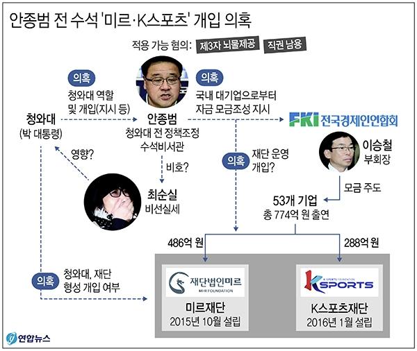 안 전 수석은 그동안 "기업들의 미르재단 모금 과정에 전혀 개입한 적 없다"면서 혐의를 부인해 왔으나 재단 관계자들은 계속해서 이와 반대되는 주장을 하고 있다. 이 때문에 이날 검찰 수사에서 안 전 수석도 "박 대통령의 지시에 따라 업무를 수행했다"는 취지의 발언을 한 것으로 알려졌다. 안 전 수석이 이 같은 주장을 계속하게 되면 미르·K스포츠 재단 모금의 책임은 박 대통령에게 돌아가게 된다. 이 때문에 박 대통령에 대한 검찰 조사 필요성이 다시 부각되고 있다. 김현웅 법무부 장관은 "수사에는 강제 수사가 있고, 강제 없이 임의적으로 하는 수사가 있을 수 있다"면서 "학계 대부분은 대통령에 대해 강제적으로 진실을 들을 방법은 허용되지 않는다는 쪽이 다수설"이라고 설명했다.