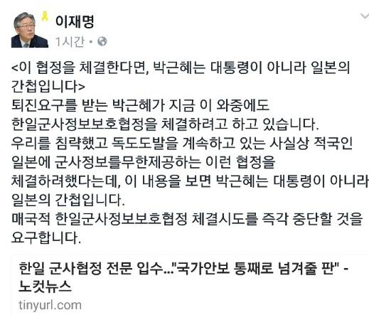 이재명 시장은 7일 자신의 페이스북에 '한일 군사협정 전문 입수' 제목의 기사와 함께 '이 협정을 체결한다면, 박근혜는 대통령이 아니라 일본의 간첩입니다'라고 운을 뗐다.