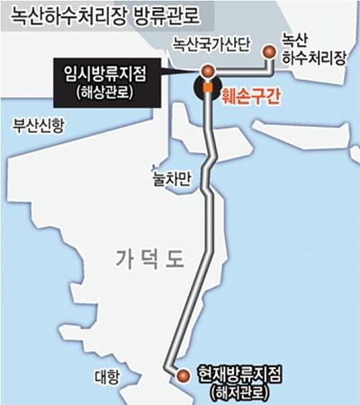 녹산하수처리장은 10㎞가량의 해저 방류관로를 통해 강서구 대항동 인근 먼바다에서 하수를 방류해 왔다. 그런데 2013년 12월과 2014년 1월 방류관로에서 구멍과 함께 누수 현상이 발견됐다. 이후 부산시와 환경공단은 지난해 12월 해저 방류관이 242m 구간에 걸쳐 심하게 찌그러져 있고 구멍이 뚫려 있는 것을 조사 결과 확인했다. 이후 시공사인 쌍용건설과 부산시 간에 관 누수 책임을 두고 소송이 진행 중이다. 부산시는 지난 4월 하자 구간 우선 보수를 진행하기로 했고 작업이 이뤄지는 동안 해저 관로가 아닌 눌차만 인근 해상 관로로 방류를 계획하게 됐다.