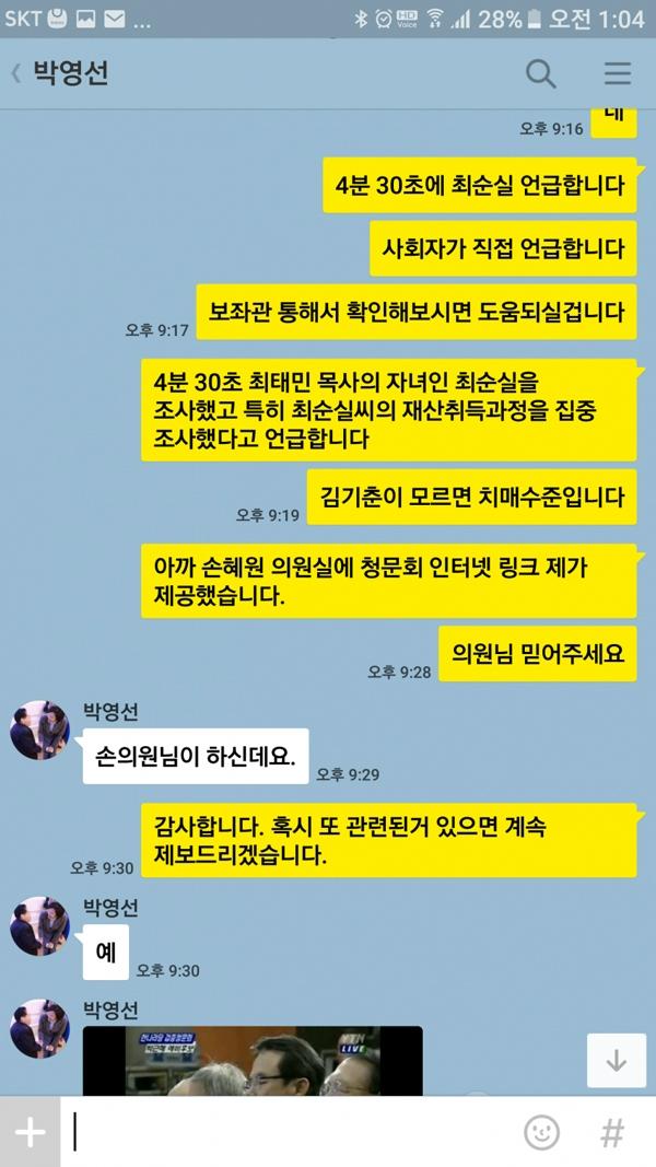 공개된 대화에서 이 누리꾼은 "위증을 하고 있는 김기춘의 증거 영상이다. 4분30초부터 보시면 김기춘이 참석한 가운데 박근혜가 답변한다"는 글과 영상 링크를 보냈다.