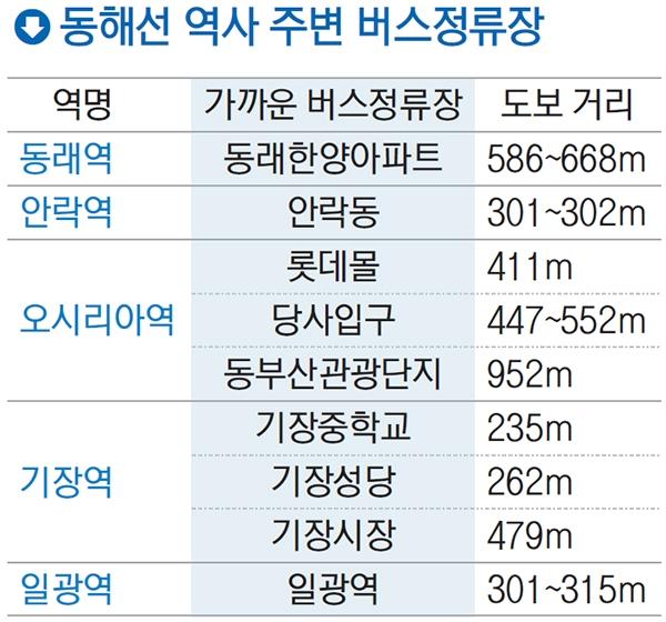 동해선 동래역과 안락역은 인근에 버스 노선이 아예 없는 것으로 확인됐다. 신해운대역엔 139번 시내버스와 마을버스 1대가 운행하지만, 이마저도 배차간격이 15~25분으로 길다.