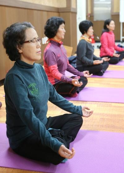 지난 2일 오전 찾아간 부산 금정구 구서1동 주민센터 2층 교양강좌실에서 열린 '행복한 나를 찾는 치유 명상'(이하 치유 명상) 수업은 6년째 이어지는 강좌. 최근 주민자치센터 프로그램이 다양해졌다고는 해도 명상 수업을 진행하는 곳은 드물다. 2017년 새해 첫 수업인 데도 남성 수강생 2명을 포함해 10여 명이 참석했다. 그들에게 명상이 주는 매력은 무엇인지 들어 봤다.
