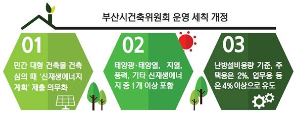 '신에너지 및 재생에너지 개발·이용·보급 촉진법'에 공공 건축물은 신재생에너지 시설 설치를 의무화했지만 민간 건축물까지 포함하는 것은 이례적이다. 부산시 건축주택과 관계자는 "지난해 건축 심의 대상이 된 대형 건축물의 85% 이상이 아파트였다"며 "신재생에너지에 대한 인식을 높이고, 원자력발전을 점진적으로 대체하기 위해 이 같은 정책을 시행한다"고 밝혔다.