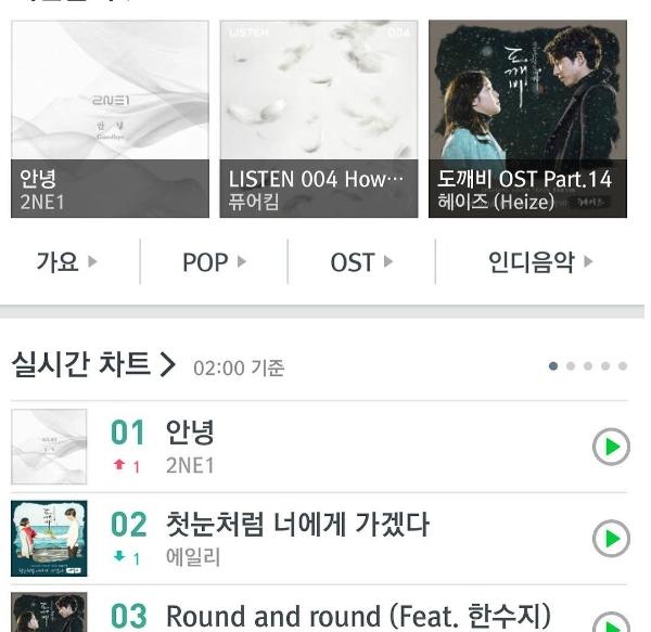 공개된 사진은 온라인 음원사이트의 실시간 차트를 캡처한 것으로, 2NE1의 '안녕'이 1위를 기록하고 있다.