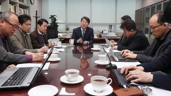 한신협 소속 언론사와 인터뷰를 갖고 있는 안철수 후보. 박희만 기자국민의당 안철수 전 대표는 22일 한국지방신문협회 초청 대선주자 토론회에서 '강철수'의 면모를 부각시켰다.