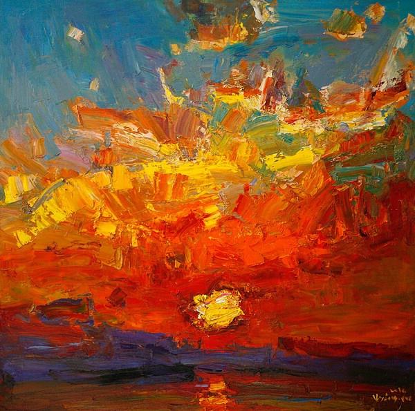 홍경표 작 '색-생명 2016'. 동해안 일출을 표현했다. 갤러리조이 제공거칠고 속도감 있는 터치와 나이프(Knife)로 물감을 두껍게 발라 마티에르 효과를 극대화한다. 여기에 원색의 강렬한 색채까지 더해 그림을 보는 이로 하여금 시각적 생동감을 넘어 온몸으로 에너지를 느끼게 한다.