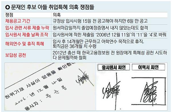 문 후보의 아들 준용씨는 2006년 12월 공공기관인 한국고용정보원에 5급 일반직 신입 직원으로 채용됐다. 권재철 당시 고용정보원장은 노무현정부에서 문 후보가 청와대 민정수석을 지낼 때 그 밑에서 노동 담당 행정관을 지낸 인물이다.