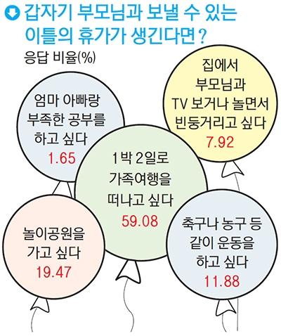 '무엇을 할 때 가장 행복한가?'라는 질문에는 응답자 64.8%가 '가족과 여행 갈 때'라고 답해 2위를 차지한 '온 가족이 모두 모여 저녁밥을 먹을 때'(13.49%)와 압도적인 격차를 보였다. '갑자기 부모님과 보낼 수 있는 이틀의 휴가가 생긴다면?'에 대해서도 응답자의 절반 이상(59.08%)이 '1박 2일로 가족 여행을 가고 싶다'고 대답해 어린이들 상당수가 가족 또는 부모와 함께 하는 여행에 대한 기대와 만족감이 매우 높은 것으로 분석됐다.