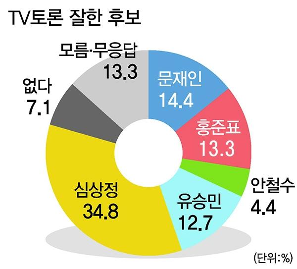 중앙선거관리위원회의 2차 토론이었던 지난달 28일 TV토론에서 가장 토론을 잘 한 후보에 대한 질문에는 정의당 심상정 후보(34.8%)라는 응답이 가장 많았다. 더불어민주당 문재인 후보가 14.4%로 그 뒤를 이었고 자유한국당 홍준표 후보가 13.3%, 바른정당 유승민 후보 12.7%, 국민의당 안철수 후보 4.4% 순이었다.