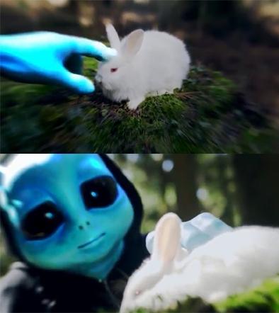 공개된 영상에서는 숲 속의 외계인이 토끼를 조심스럽게 쓰다듬고 있다.