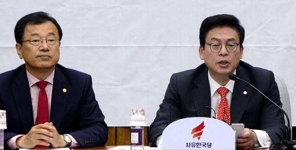 자유한국당 정우택(오른쪽) 대표 권한대행 겸 원내대표가 23일 국회에서 열린 원내대책회의에서 모두발언을 하고 있다. 박희만 기자 phman@문재인 대통령의 4대강 정책감사 지시에 대한 보수진영의 반발이 갈수록 거세지고 있다.