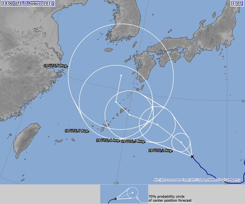 2일 오전 3시 기상청 발표에 따르면 현재 노루는 일본 오키나와 동쪽 약 910km 부근 해상을 지나고 있다. 노루는 4일 오전 3시께 일본 오키나와 동북동쪽 약 470km 부근 해상에 위치할 것으로 전망돼 제주도 일대가 영향권에 들어갈 것으로 보인다.