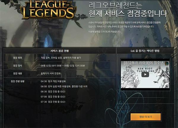 리그오브레전드 홈페이지.리그오브레전드는 2일 오전 6시부터 오후 1시까지 총 7시간 동안 서버 점검을 실시한다.
