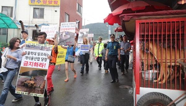 부산동물학대방지연합, 개고기를 반대하는 친구들, 동물권단체 케어, 전국동물보호활동가연대 소속 활동가들이 지난달 22일 부산 북구 구포가축시장 앞에서 개고기 시장 폐쇄를 요구하는 행진을 하고 있다. 이재찬 기자 chan@탕제원에서 탈출한 개를 잔인하게 끌고 가는 사건(본보 지난달 21일 자 9면 등 보도) 등 최근 갈등이 잇따르고 있는 구포가축시장 문제를 해결하기 위한 TF팀이 가동된다.