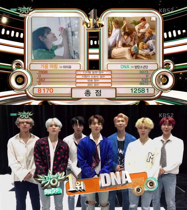 9일 오후 방송된 KBS 2TV '뮤직뱅크'에서 방탄소년단이 새 미니앨범 '러브 유어 셀프 승 허'(Love Yourself 承 Her)의 타이틀곡 'DNA'로 1위를 차지했다.