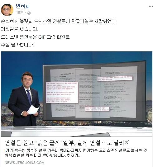 이에 변희재 미디어워치 대표고문이 "손석희(는) '태블릿의 드레스덴 연설문이 한글파일로 저장되었다'(라고) 거짓말을 했습니다"라며 "드레스덴 연설문은 GIF 그림 파일로 수정 불가합니다"라고 지적했다.