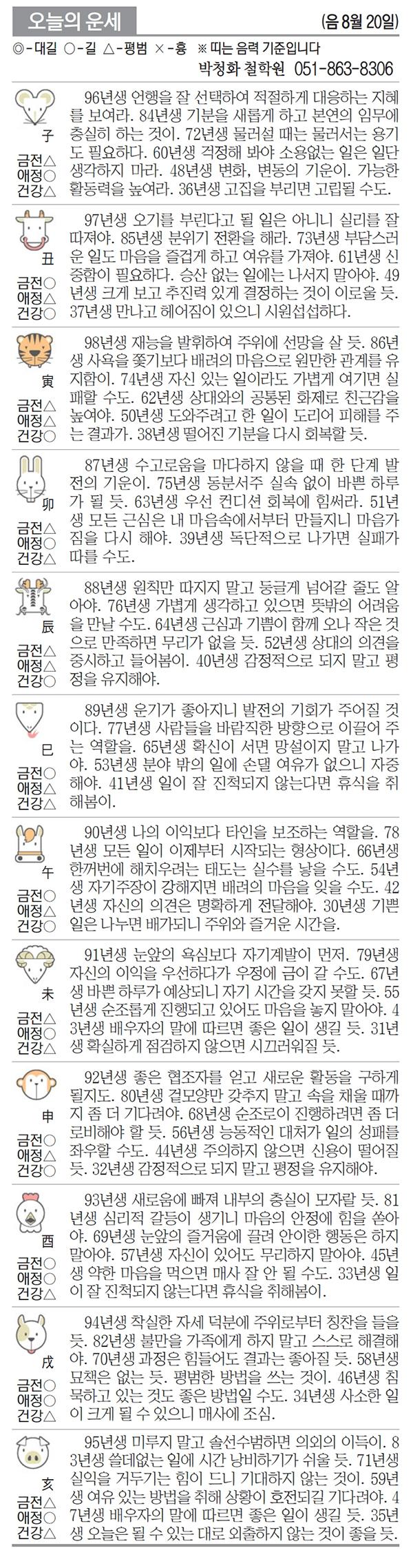 [부산일보 오늘의 운세] 10월 9일 월요일 (음 8월 20일)
