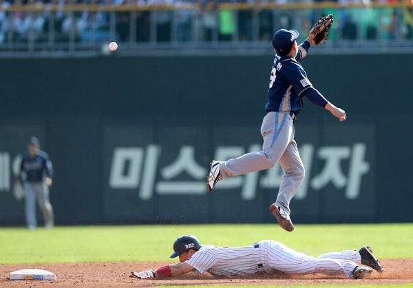 9일 오후 부산 사직구장에서 열린 2017 KBO 포스트시즌 롯데 자이언츠와 NC 다이노스의 준플레이오프 2차전. 롯데 손아섭이 3회말 2사 1루에서 이대호 타석때 2루 도루에 성공하고 있다. 연합뉴스롯데 자이언츠가 프로야구 준플레이오프 2차전에서 타순을 대폭 조정하고 승부수를 던졌다.