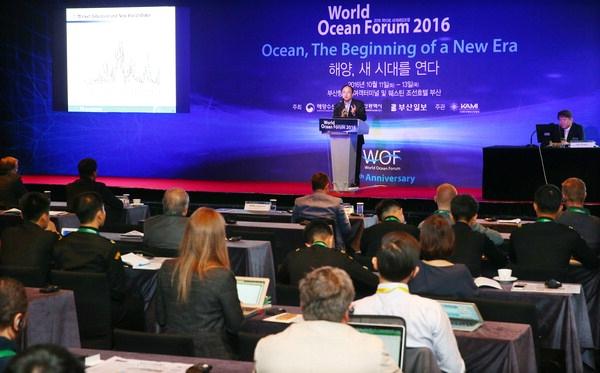 18일 해운대 웨스틴 조선호텔 부산에서 4차 산업혁명 시대를 맞아 새로운 해양 비즈니스 플랫폼을 만들기 위한 '2017 세계해양포럼(WOF)'이 열린다. 사진은 지난해 세계해양포럼에서 주제 발표가 이뤄지는 장면. 부산일보DB인류의 블루오션인 해양산업의 가치 극대화 방안을 모색할 올해 세계해양포럼은 정규 세션과 특별 세션, 특별 프로그램으로 알차게 구성돼 있다.