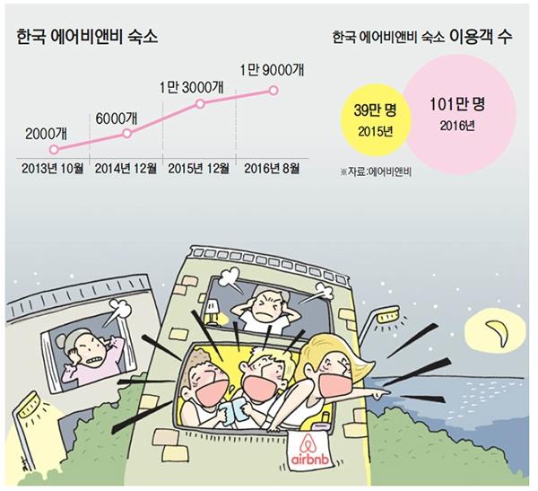 에어비앤비는 인터넷을 통해 '남는 방'이 있는 집주인과 빈방을 찾는 여행객을 연결해주는 숙박 공유(共有) 서비스다. 2013년 1월 설립된 에어비앤비코리아에 등록된 숙소는 지난해 9월 1만 9000여 곳으로 2013년 10월(2000곳)보다 무려 9배 이상 늘었다. 한국 에어비앤비 숙소를 찾은 외국인 관광객도 2016년 한 해 동안 51만여 명으로 2015년도(22만여 명)보다 2배 이상 증가했다.