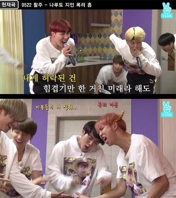21일 오후 네이버 V앱 방탄소년단 채널을 통해 방송된 리얼리티 예능 'Run! BTS'에서는 MT를 떠난 방탄소년단 멤버들이 노래방 기계를 이용해 서로의 노래 실력과 흥을 뽐내는 모습이 그려졌다.