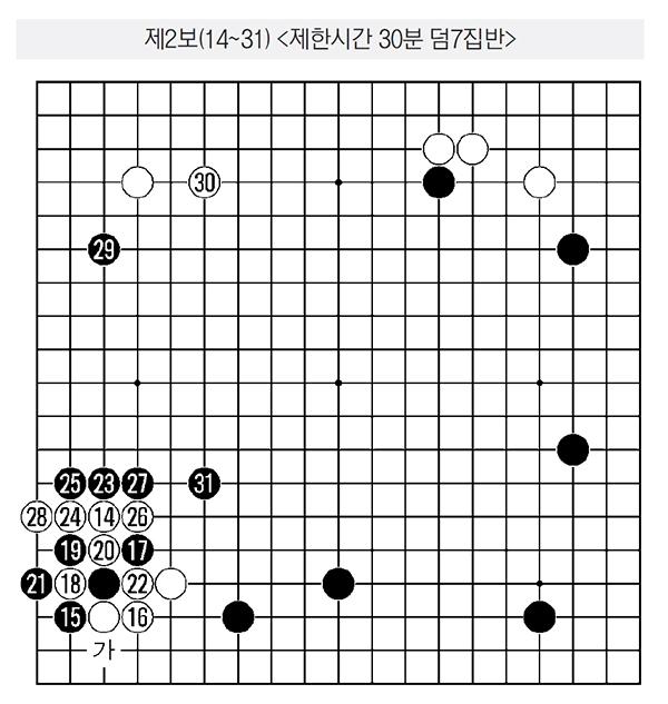 실전에서는 흑21로 때려 내고서 23으로 맥을 구사하며 타개한다. 흑25, 27 등으로 사석작전을 구사하며 흑은 외곽을 선호한다. 흑31까지 일단락이 되었다. 얼핏 보게 되면 백의 실리가 많은 것으로 보이지만 귀의 흑이 다 잡힌 것이 아니다. 흑'가'로 젖히게 되면 수가 나든지 아니면 하변에서 끝내기로 이득 보는 수가 남는다. 진재호 바둑평론가