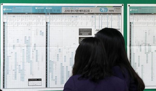 2018학년도 대학수학능력시험 성적표 배부일인 12일 오전 부산 동구 범일동 데레사여고에서 3학년 학생들이 성적표를 확인한 뒤 정시지원 배치 참고표를 살펴보고 있다.