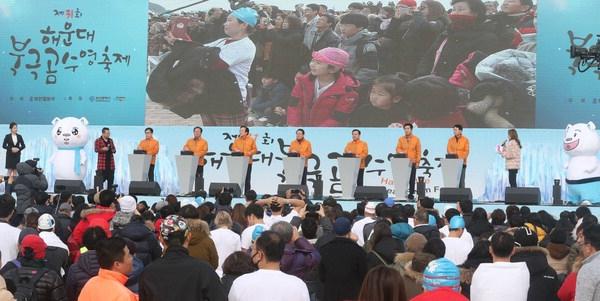 7일 부산 해운대해수욕장에서 열린 '제31회 해운대 북극곰 수영축제'에서 내빈들이 대회 시작을 알리는 버튼을 누르고 있다. 이재찬 기자![]() |