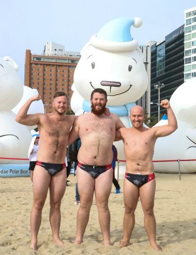 왼쪽부터 외국인 참가자 샌더스 마이클, 매트 도슨, 패너스 윌컨. 김종호 기자 kimjh@'세계 10대 겨울 이색 스포츠'로 우뚝 선 해운대 북극곰 수영축제는 올해도 명성에 걸맞게 미국과 일본 등 전 세계 15개국에서 몰려온 '외국인 북극곰'으로 인산인해를 이뤘다.