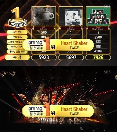 7일 방송된 SBS '인기가요'에서는 1월 첫째주 1위 후보로 트와이스 'Heart Shaker'와 딘 'Instagram', 엑소 'Uiverse'가 치열한 경쟁을 펼쳤다.