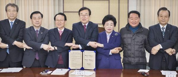 18일 오후 부산시청에서 열린 원도심 4개 구(중·서·동·영도구) 통합 합의 기자회견에서 서병수 부산시장을 비롯한 원도심 4개 구 구청장이 손을 맞잡고 있다. 부산시와 원도심 4개 구는 이날 기자회견에서 2022년 원도심 통합에 원칙적으로 합의하였다고 밝혔다. 왼쪽부터 조성제 부산상의회장, 백종헌 부산시의회 의장, 박극제 서구청장, 서병수 부산시장, 김은숙 중구청장, 박삼석 동구청장, 어윤태 영도구청장. 강선배 기자 ksun@부산시와 원도심 4개 구(중·서·동·영도구)가 2022년 7월 1일까지 원도심 통합구를 출범시키기로 합의했다. 당초 올해 7월 1일로 잡힌 목표보다는 일정이 늦춰졌지만, 그동안 반대 입장을 보여 온 중구의 합의를 끌어내는 데 성공해 통합 절차에 탄력이 붙게 됐다.
