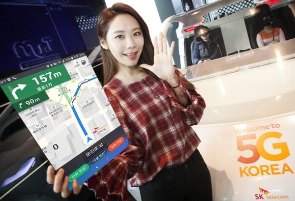 모델이 기능이 강화된 T맵X누구를 알리고 있다. SK텔레콤 제공국내 이동통신업계의 모바일 내비게이션 경쟁이 뜨겁다.