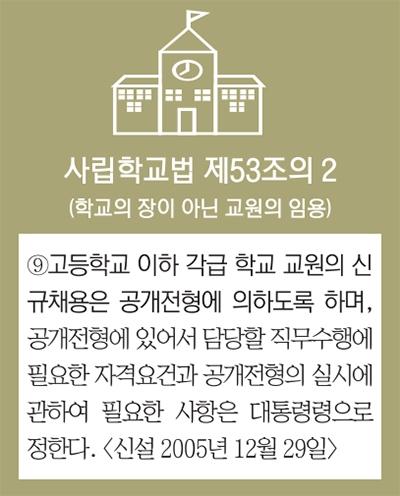 교육부는 최근 교감 재임용 문제와 관련한 본보 질의에 대해 "교장은 이사장이 임용하지만, 그 외 교감을 포함한 교원은 최초로 임용될 때 공채를 거치지 않았다면 (재임용은)위법 소지가 있다"고 밝혔다. 교육부는 현행 사립학교법 53조의 '교원의 신규채용은 공채(공개전형)를 거쳐야 한다'는 규정을 그 근거로 댔다.